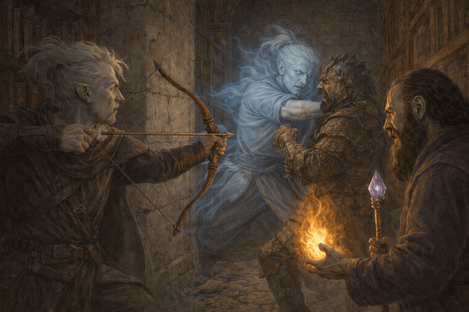 - Scriptorium Ambush: The light opens a door to a large scriptorium. As the party enters (leaving Tyrius behind to hold the light), three Ghosts manifest from the bookshelves.